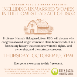 This one-hour program will be about 45 minutes of a lecture provided by USD Professor Hannah Haksgaard. Followed by a discussion and Q&A period. The talk will cover Hannah's research into why congress allowed single women to claim homesteads. It is a fascinating history that connects women's rights, land ownership, and the statutory process.