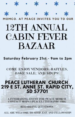 Peace Lutheran MomCo is hosting their 12th Annual Cabin Fever Bazaar at Peace Lutheran Church, 219 E St Anne, Rapid City, on Saturday, February 21st, 2026 from 9am to 2pm with vendors, raffles, soups, and a bake sale. All are welcome to come shop and fellowship! Please send questions to [email protected]