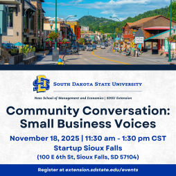 As the Ness School of Management & Economics at SDSU deepens its presence in the Sioux Falls region, we’re turning outward – listening first to the community to guide what comes next. This event is part of a multi-session listening tour focused on hearing from many voices including small businesses, startups, nonprofits, and other local partners who help drive regional growth. Small businesses are at the heart of Sioux Falls’ success and so are the people and partners who support them. If that’s you, this session is for you!