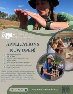 The South Dakota Volunteer Naturalists Program is now accepting applications for the 2025 class. The 12-week program with online evening classes begins Tuesday, March 4, 2025. Graduates will share their new knowledge with others through volunteer opportunities, including leading educational programs, participating in conservation activities, and contributing to citizen science projects.