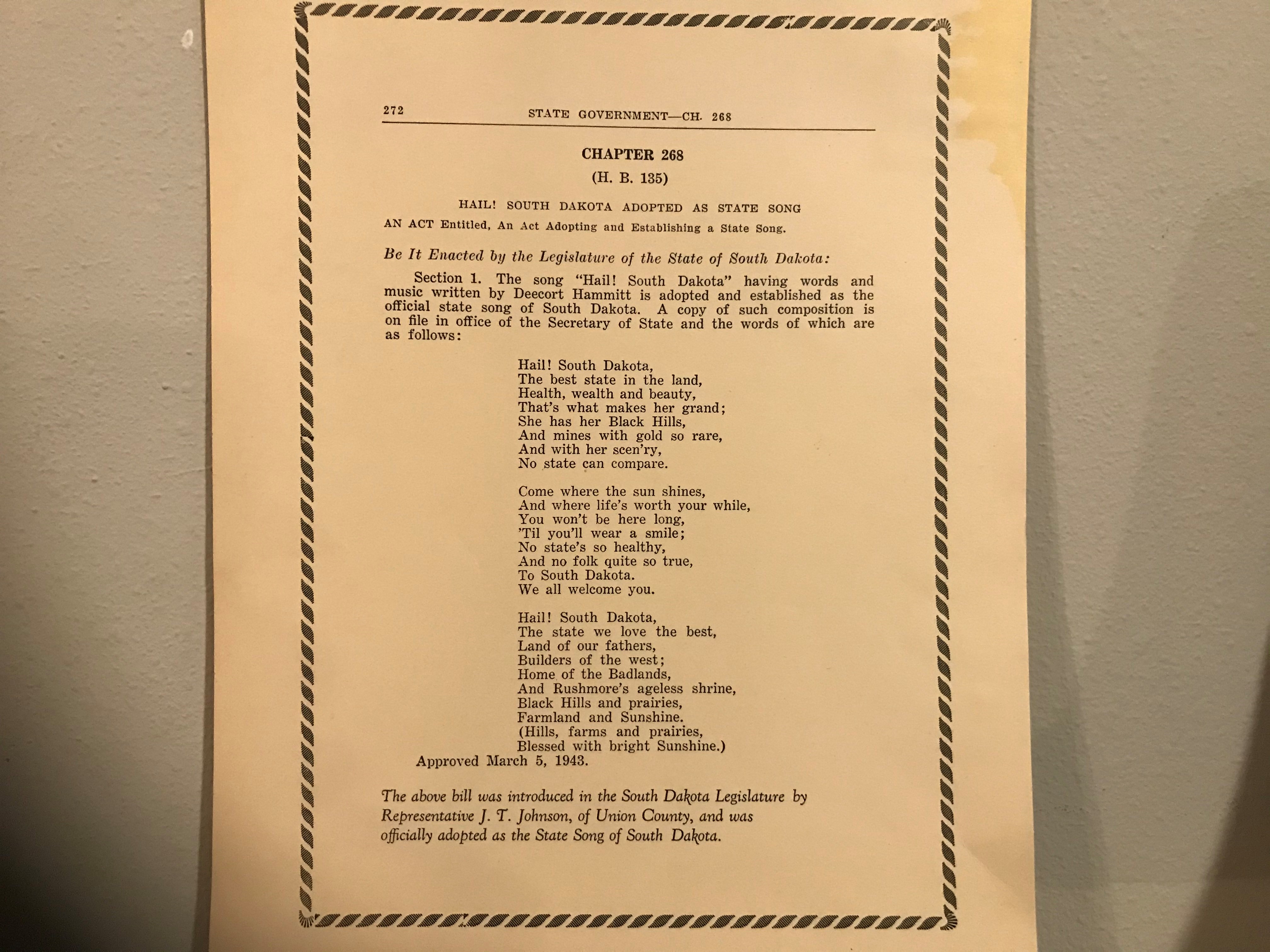 There were 158 songs entered! The judging committee selected 6 songs they considered the best out of the 158. In a unique feature of the contest, every resident of South Dakota was given a chance to vote for their favorite. Radio stations across the state played the 6 songs for a period of time. Ballots were printed in newspapers all over the state and the people of SD voted. ‘Hail! South Dakota,’ written by DeeCort Hammitt of Alcester, was the top vote getter in January of 1942. Governor Harlan Bushfield presented Hammitt with an award for composing the new state song, and a bill to make it official was approved by the Legislature in March 1943.